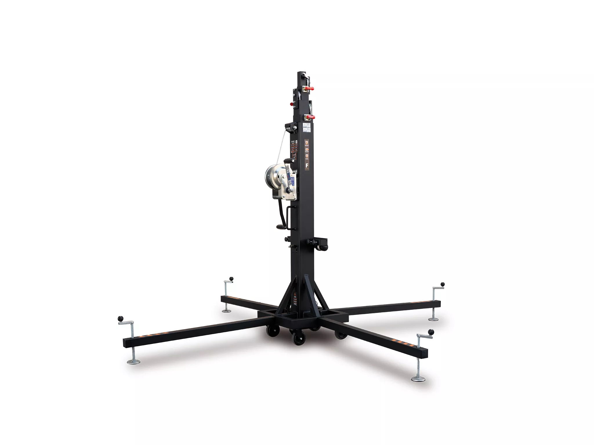 La torre elevadora telescópica modelo T 106 es una torre diseñada para levantar cargas verticales hasta 225 Kg y 6,4 metros de altura. Compuesta por 5 perfiles de acero extensibles elevados mediante un cable de acero de alta resistencia. Fijación del tramo de la torre a la altura de trabajo con pasador de seguridad automático de acero. Patas con apoyos antideslizantes de goma. Todo el sistema se opera mediante un cabrestante de accionamiento manual.